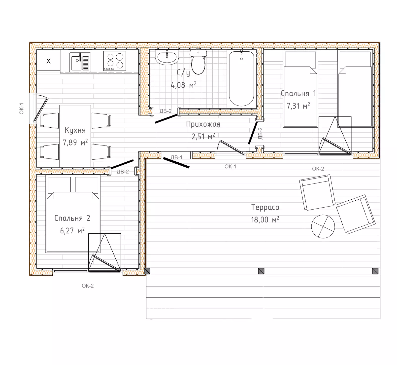 ● Терраса (18 м²): Просторная открытая площадка у входа, где можно разместить зону отдыха, обеденный стол или шезлонги для летнего отдыха.