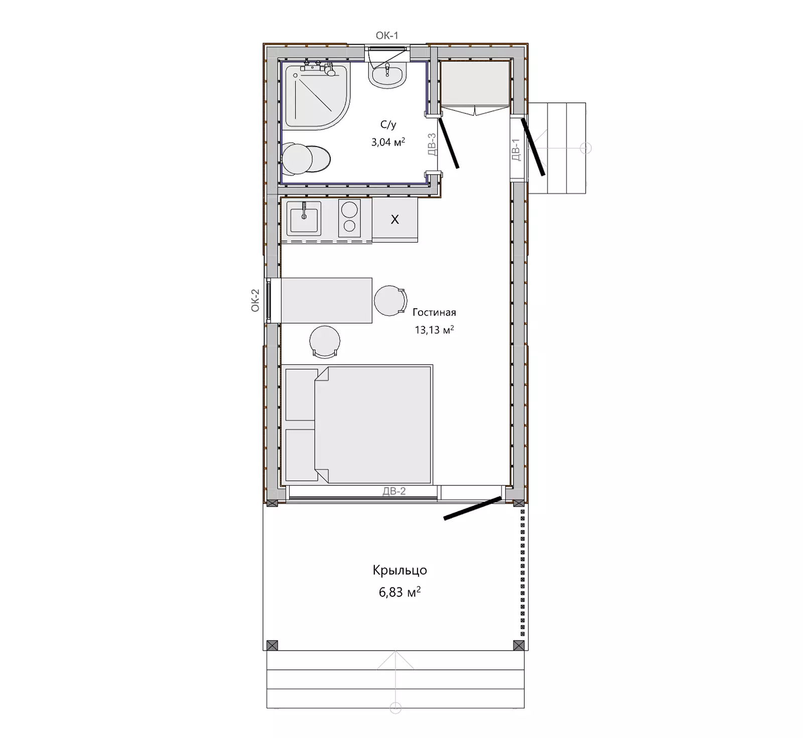 Модульный дом 6 на 3.4 метра (площадь около 20 м²) идеален для небольшого участка в Новосибирске и области. Компактная планировка для 1-2 человек: кухня-гостиная со спальной зоной, отдельный санузел и просторное крыльцо.